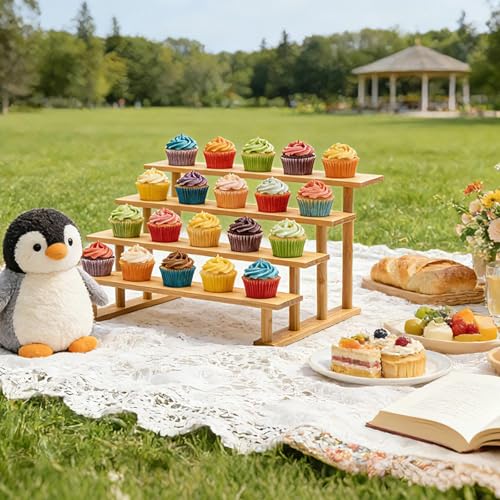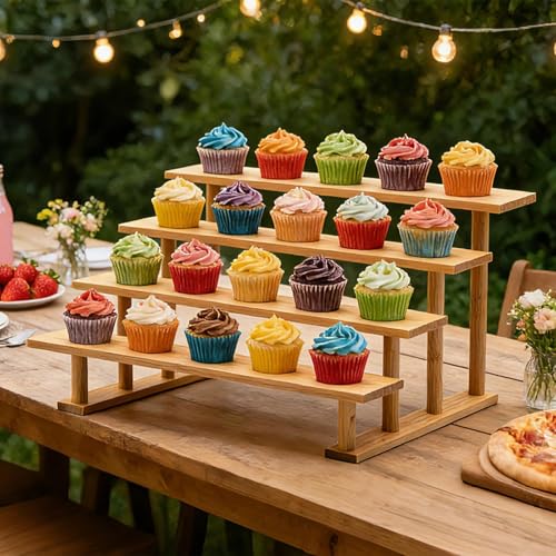 - حامل كب كيك من الخيزران الطبيعي: حامل حلوى خشبي من 4 طبقات مصنوع من الخيزران عالي الكثافة. يتناغم اللون الطبيعي لحامل الكب كيك بشكل جيد مع أجواء حفلات أعياد الميلاد وحفلات الزفاف. السطح المطلي لحوامل الكب كيك الخشبية أملس وسهل التنظيف.