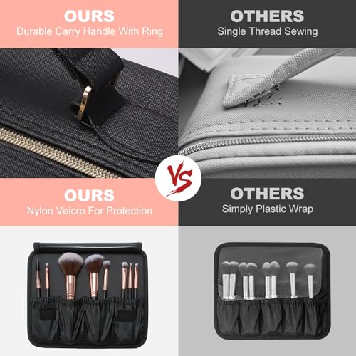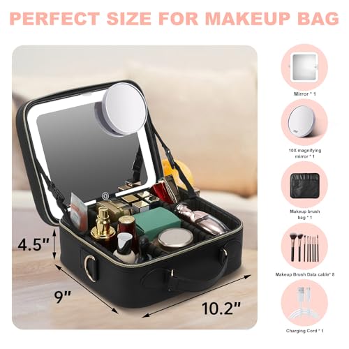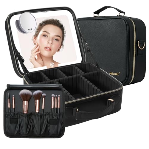 Mocado - موكادو شنطة مكياج للسفر مع مراة LED، منظم مكياج، شنطة مكياج مع 3 اعدادات اضاءة ملونة ومرآة مكبرة 10 مرات، 8 فرش مكياج، شنطة مستحضرات تجميل بفواصل قابلة للتعديل (اسود)
