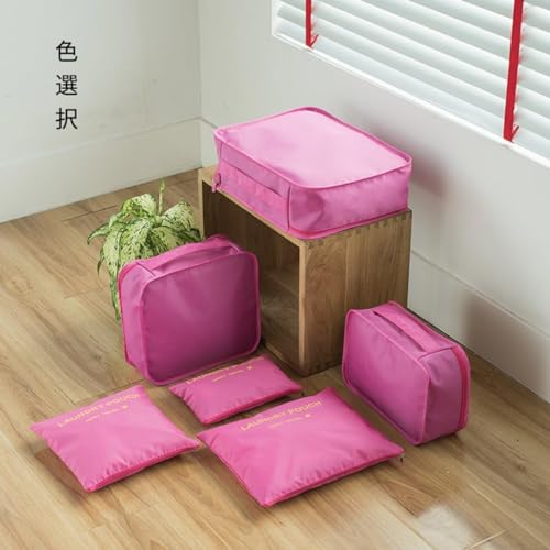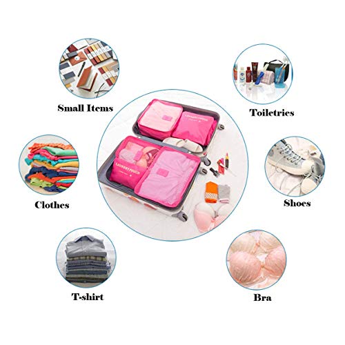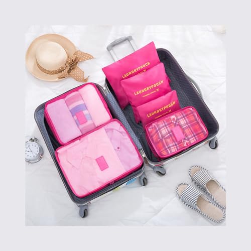 MOCOFO - مجموعة شنط تخزين مكعبة الشكل موكوفو مكونة من 6 قطع بلون فوشيا مضغوط باللون الزهري لتنظيم شنط السفر قابلة للطي لتخزين الملابس واكياس الغسيل والاكسسوارات، شنطة تعبئة مقاومة للماء، قماش، أحمر وردي