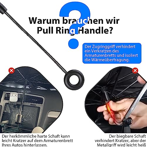 - مقبض حلقة سحب مقاوم للخدش وعازل للحرارة: صُممت مظلة السيارة خصيصًا لمنع تقادم الأجزاء الداخلية للسيارة. على عكس المنتجات الأخرى ذات أعمدة الشماسات المعدنية الطويلة التي ستخدش سيارتك دائمًا، تجمع شماسة السيارة الخاصة بنا بين الأعمدة القصيرة وسلك السحب الناعم ومقبض حلقة السحب لتجنب خدش سيارتك. وتمنعك من حرق يديك على عمود معدني ساخن.