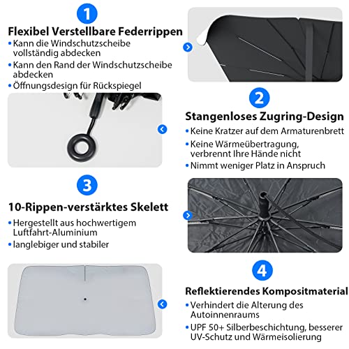 - هيكل مقوى بـ 10 أضلاع: تتميز مظلة السيارة، المطلية بلاصق فضي من التيتانيوم، بقدرة استثنائية على العزل الحراري وعكس الأشعة فوق البنفسجية، مما يوفر حماية لا تشوبها شائبة للأجزاء الداخلية للسيارة. الهيكل المقوى بـ 10 أضلاع مصنوع من ألومنيوم الطائرات المقاوم للصدأ وخفيف الوزن وعالي القوة، مما يضمن متانة فائقة