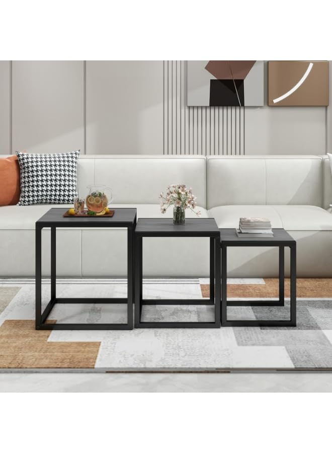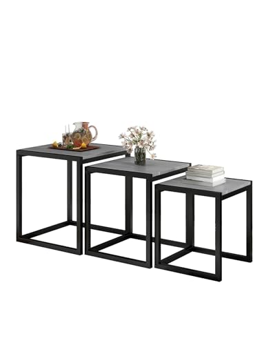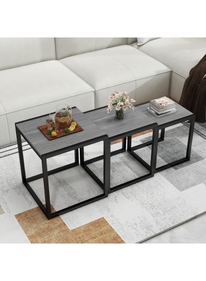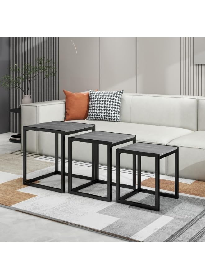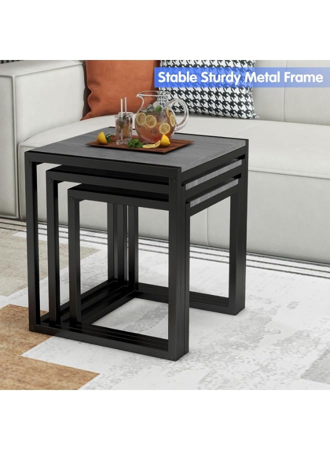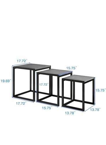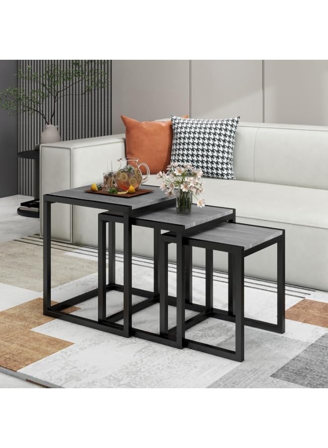 Generic - طقم طاولات متداخلة عصرية من 3 قطع، طاولات جانبية مربعة مع اطار معدني قوي، تصميم قابل للتكديس موفر للمساحة، رمادي، نمط صناعي