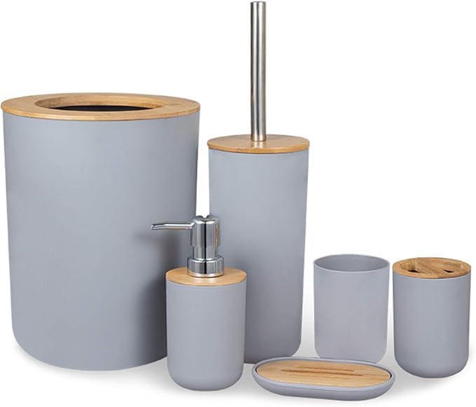 Generic - مجموعة اكسسوارات حمام عصرية مكونة من 6 قطع، لون رمادي مع أغطية من البامبو، تصميم دائري