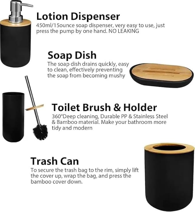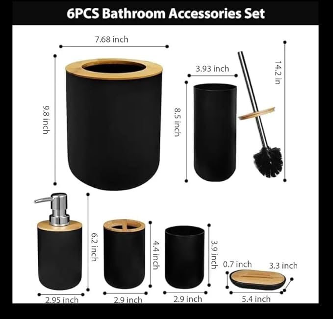 - مجموعة كاملة: تتضمن مجموعة إكسسوارات الحمام الحديثة المكونة من 6 قطع موزع صابون وحامل فرشاة المرحاض وسلة مهملات وحامل فرشاة أسنان وكوب وصحن صابون
