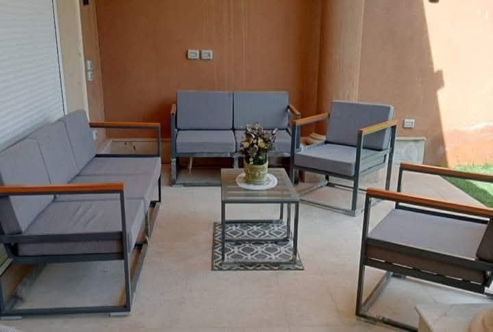 - تصميم عصري: طقم أثاث خارجي أنيق مكون من ٥ قطع بإطار معدني متين وتشطيب راقي يناسب الشرفات والحدائق