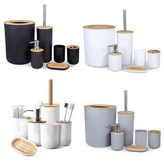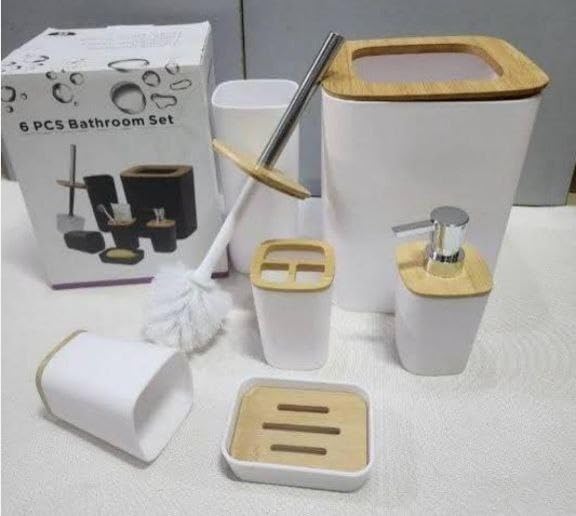 - مجموعة كاملة: مجموعة إكسسوارات حمام حديثة مكونة من 6 قطع تتضمن سلة مخلفات بغطاء خشبي وفرشاة مرحاض مع حامل وموزع صابون وحامل فرشاة أسنان وحامل شفرة حلاقة وطبق صابون