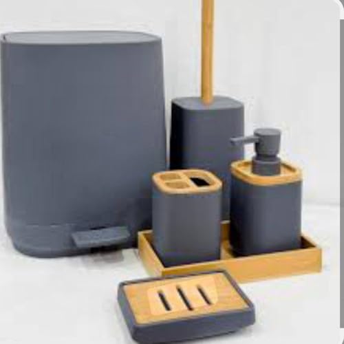 Generic - طقم حمام مودرن ٦ قطع، سلة نفايات ٦ لتر، حامل صابون، موزع صابون، حامل فرش أسنان، قاعدة خشبية، فرشاة مرحاض، متوفر باللون الأسود والأبيض والرمادي (رمادي)