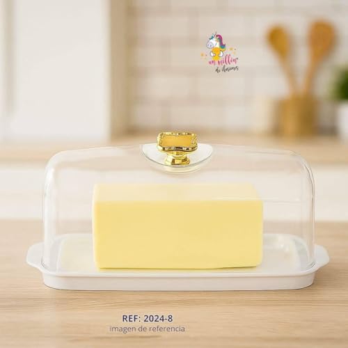- تصميم أكريليك أنيق: غطاء أكريليك شفاف يحافظ على الزبدة مرئية وطازجة بينما يضيف المقبض الذهبي لمسة من الفخامة إلى مطبخك أو طاولة الطعام.