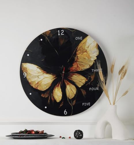 - تصميم فني: ساعة حائط مذهلة على شكل فراشة تتميز بزخارف فراشة ذهبية على خلفية سوداء، مما يخلق تباينًا أنيقًا لديكور المنزل الحديث