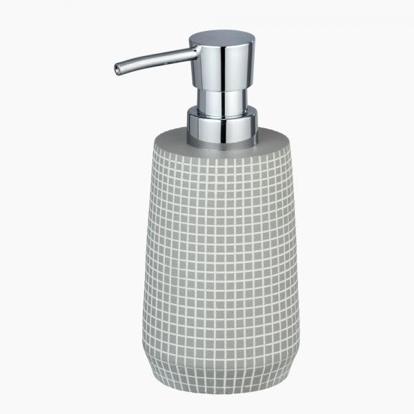 • تصميم عصري: موزع صابون سيراميك أنيق يتميز بنمط شبكي متطور باللون الرمادي مع مضخة علوية فاخرة بلمسة نهائية من الكروم