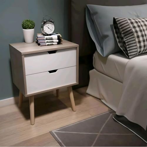 Generic - طاولة جانبية عصرية مع درجين، أبيض ورمادي، أرجل خشبية، منضدة لغرفة النوم
