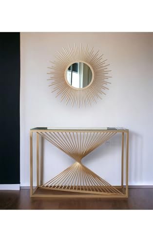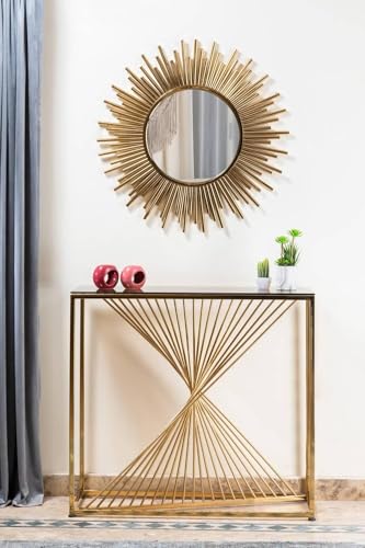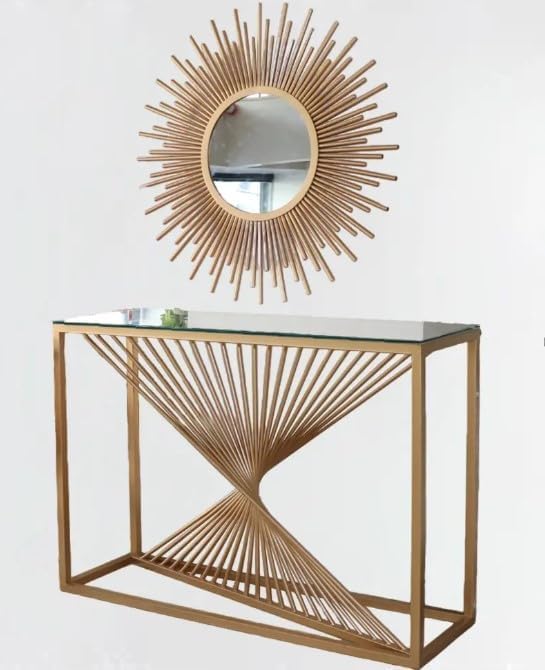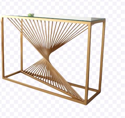 - عناصر التصميم: طاولة كونسول عصرية تتميز بتصميم قاعدة منحوتة فريدة مصنوعة من الفولاذ المقاوم للصدأ 304 الممتاز مع طلاء بي في دي عاكس لبريق دائم.