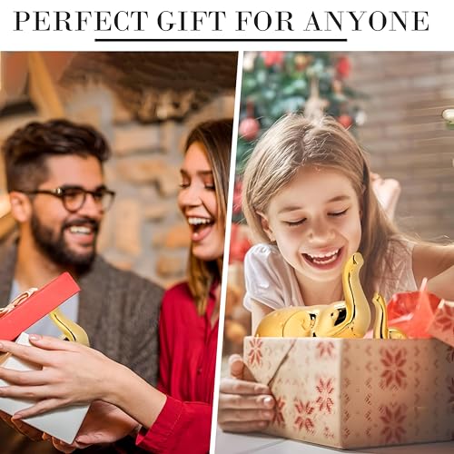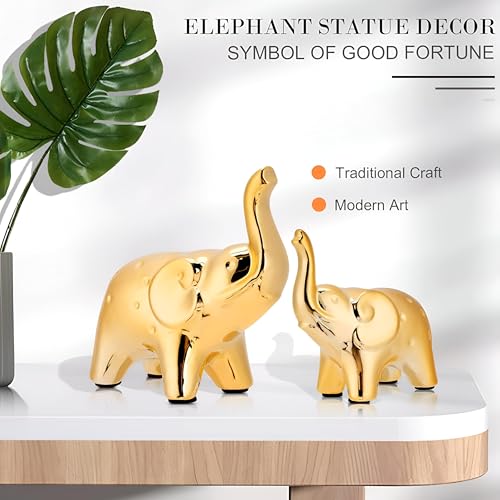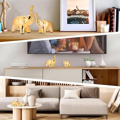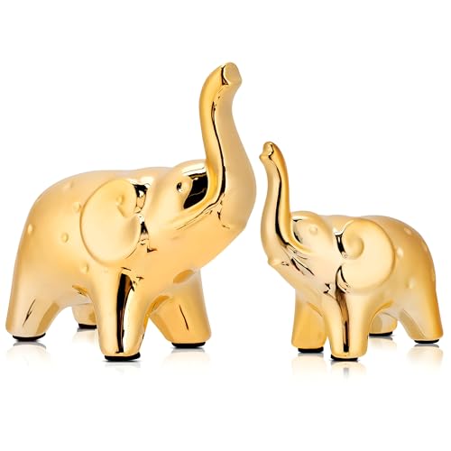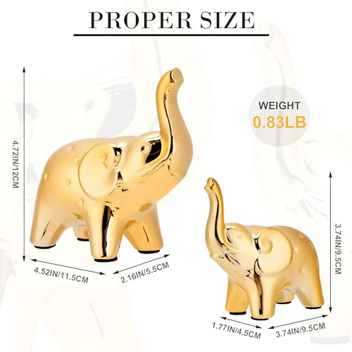 - يتكون زوج الفيل المزخرف هذا من مجسمين بحجم 9.5 × 9.5 × 4.5 سم و11.5 × 12 × 5.5 سم. مصنوعة من السيراميك عالي الجودة ومطلية بطبقة معدنية ذهبية لامعة، مما يجعلها إضافة أنيقة وجاهزة للعرض لغرف المعيشة أو الرفوف أو المكاتب أو المنضدات.