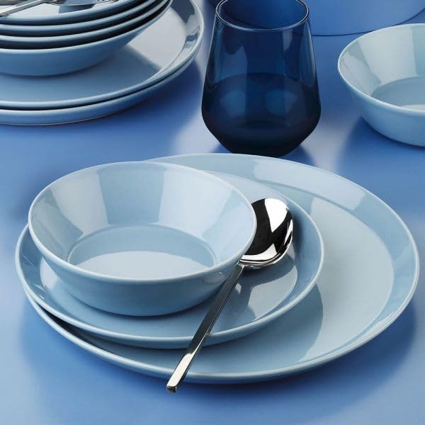 • مجموعة كاملة: طقم طعام مكون من 24 قطعة يتضمن أطباق بورسلين زرقاء فاتحة وبولات وأطباق زجاجية بلون بحري تضفي لمسة أنيقة على الطاولة.