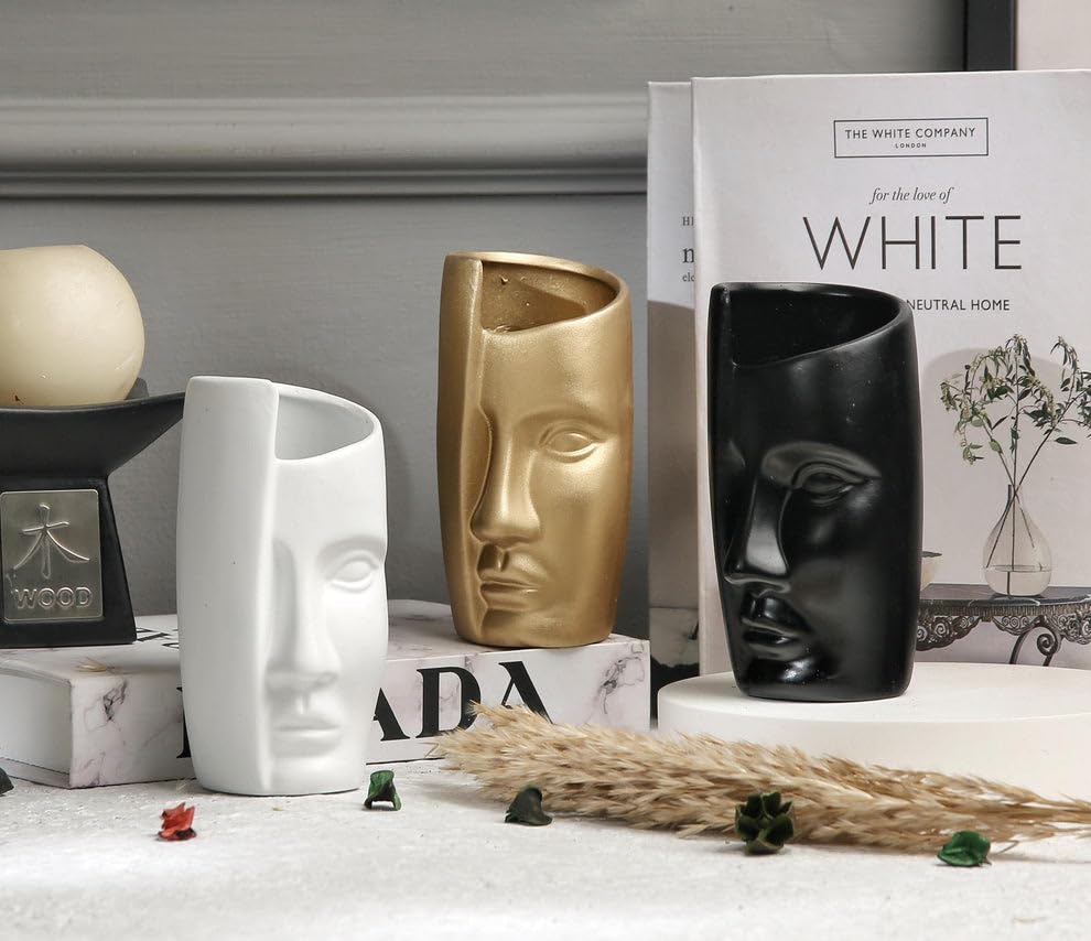 Generic - مزهريات سيراميك عصرية بتصميم نصف وجه زخرفي، باللون الأسود