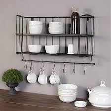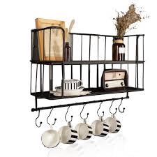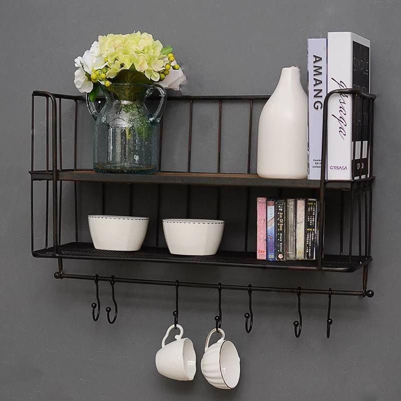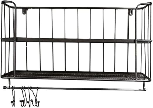 Generic - رف مطبخ جداري كبير بتصميم ريفي حديث - منظم تخزين متعدد الوظائف برفين من الخشب الصلب + 5 خطافات معدنية وشماعة للمناشف - قطعة ديكور عملية لترتيب التوابل والأواني