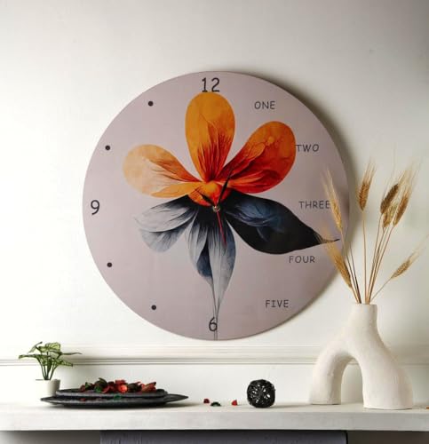 - التصميم: ساعة حائط عصرية مذهلة تتميز بتصميم زهور فنية كبيرة بألوان برتقالية وكحلية نابضة بالحياة على خلفية بيضاء