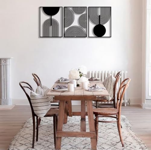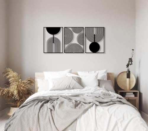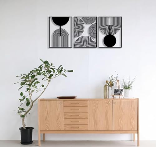 - عناصر التصميم: لوحات فنية جدارية هندسية حديثة تتميز بأنماط تجريدية جريئة باللونين الأسود والأبيض مع دوائر وخطوط وعناصر منحنية، مجموعة من 3 قطع.