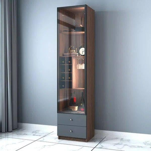 - التصميم: خزانة عرض عصرية تتميز بمزيج أنيق من خشب الجوز واللون الرمادي، مع ألواح زجاجية شفافة لعرض أنيق للعناصر.