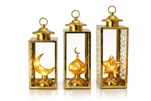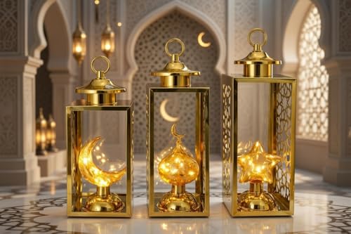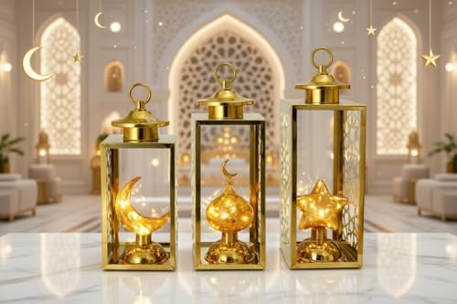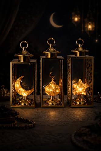 Generic - طقم فانوس رمضان ذهبي مودرن - إضاءة ليد (LED) داخلية بتصاميم إسلامية (هلال ونجمة ومسجد) - ديكور رمضاني فاخر للمنزل والمكتب