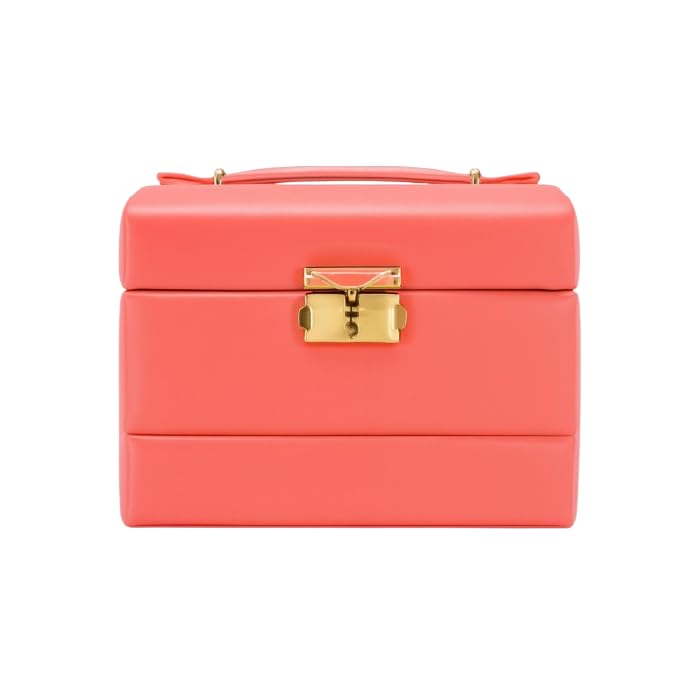 - تصميم أنيق: صندوق مجوهرات بلون مرجاني مع أجزاء صلبة ذهبية فاخرة وآلية قفل آمنة للحفاظ على الأشياء الثمينة بأمان