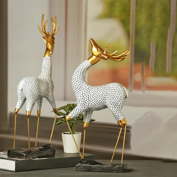 Generic - مجموعة تماثيل الرنة الحديثة، منحوتات مزخرفة باللونين الابيض والذهبي، ارتفاع 30 سم