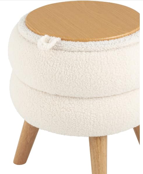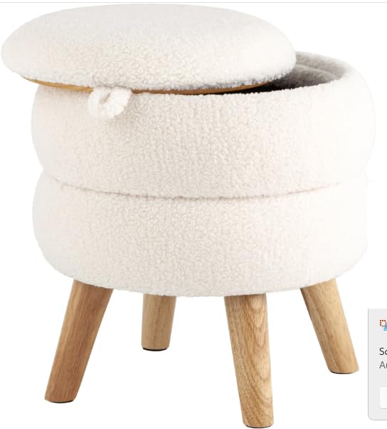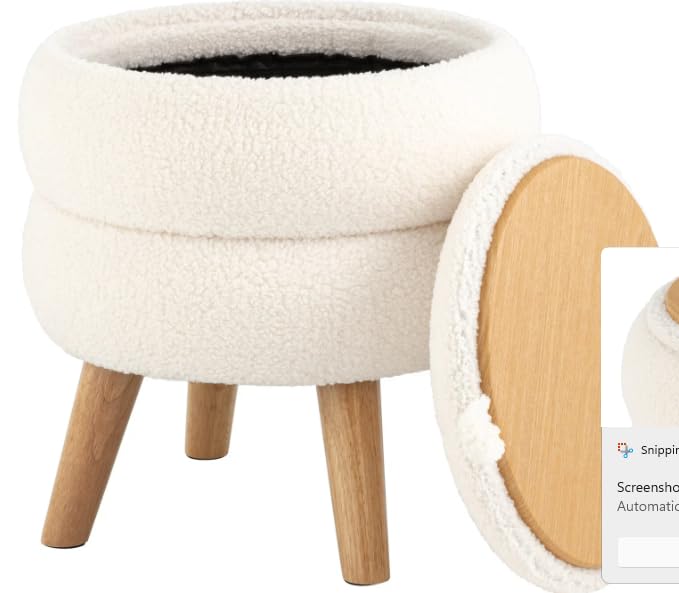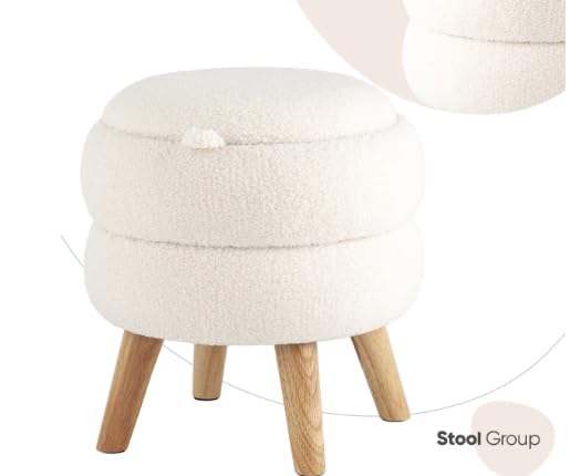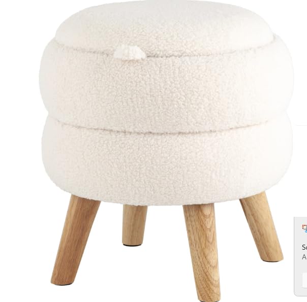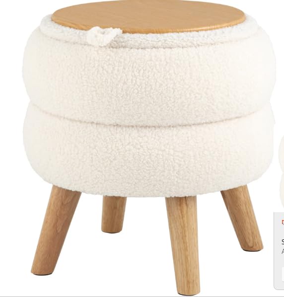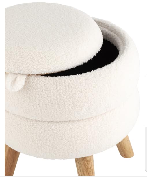 Generic - مسند قدم عصري دائري مع ارجل خشبية، مسند قدم من قماش تيدي بلون ابيض كريمي مع مساحة تخزين مخفية، مقعد فانيتي مزدوج الطبقات