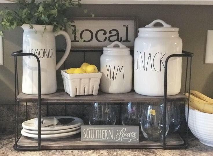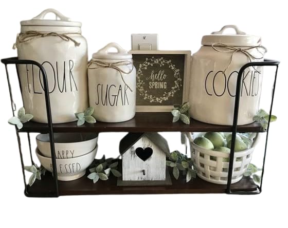 Generic - ستاند منظم قهوة ومشروبات من طبقتين بتصميم ريفي حديث – رف تقديم وديكور بأسطح خشبية صلبة وإطار معدني متين – حامل متعدد الاستخدامات للمطبخ والرسبشن والمكتب