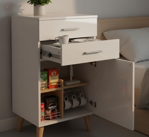 Generic - خزانة مطبخ جانبية عصرية، خشب أبيض، درجين، رفوف تخزين متعددة، أرجل خشبية، تصميم اسكندنافي