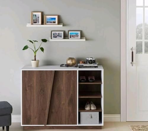 Generic - دولاب تخزين حديث بباب منزلق، وحدة رفوف بثلاثة مستويات، أثاث غرفة معيشة عصري، أبيض وخشبي غامق