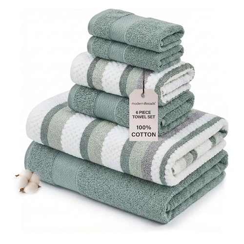 Modern Threads - مجموعة فوط جاكار مصبوغة ذات وجهين، فوط حمام وفوط يد وفوط غسيل فائقة الامتصاص وسريعة الجفاف، قطن ممشط 100% من موديرن ثريدز، 6 قطع، عاجي