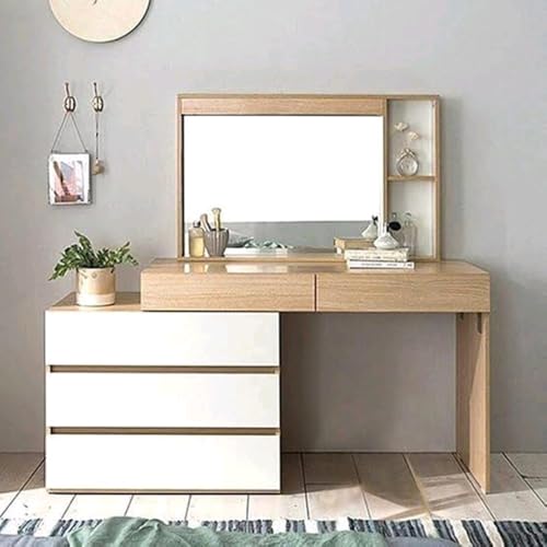 Homz - طاولة زينة عصرية مع مرآة، 5 أدراج تخزين، بلوط طبيعي ولمسة نهائية بيضاء
