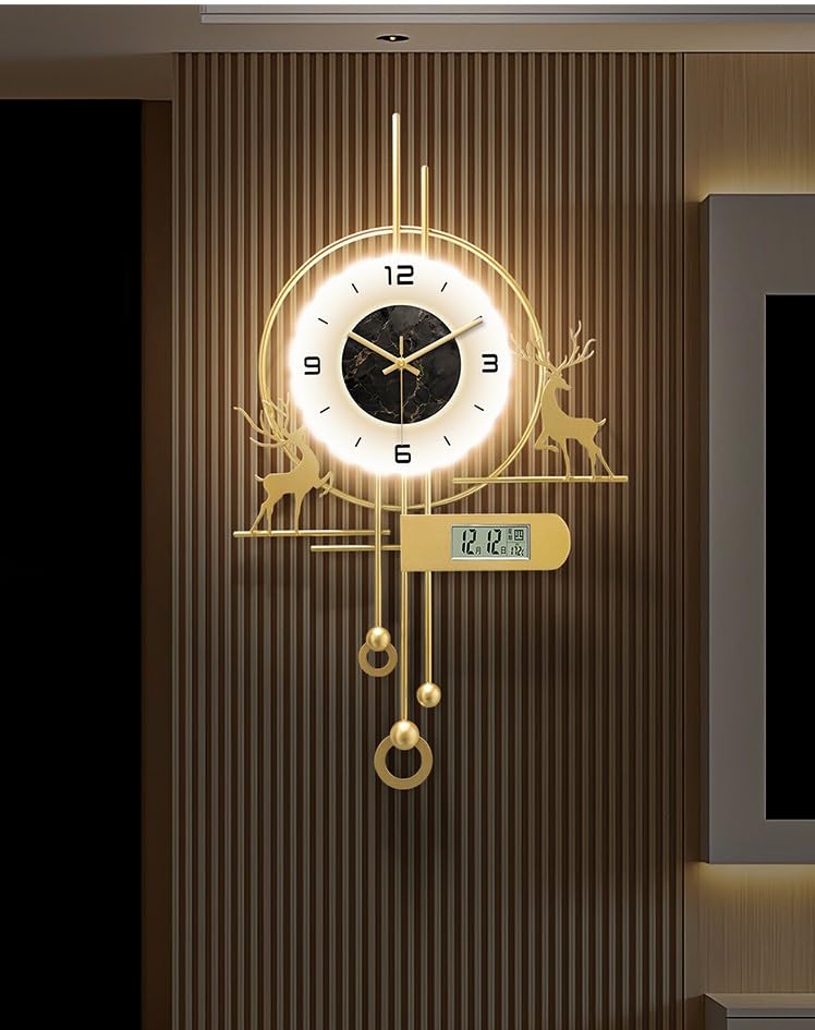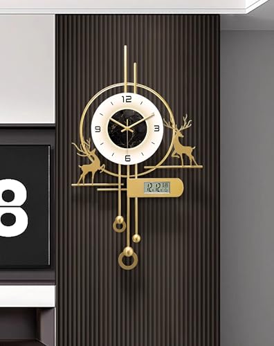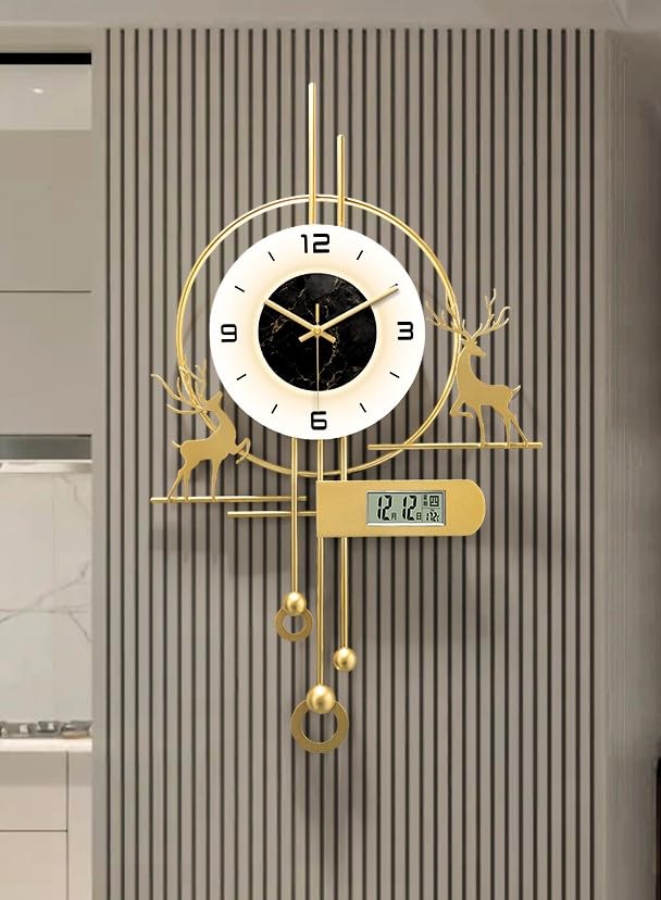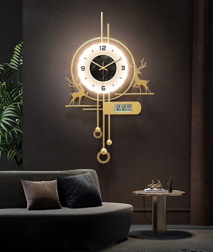 Egypt Valley Import & Export - ساعة حائط عصرية بتصميم غزال مضيئه ومزوده بساعة رقميه لغرفة المعيشة من وادي مصر الاستيراد والتصدير و، ساعة حائط كبيرة ذهبية مزخرفة مع ضوء، ساعة صامتة تعمل بالبطارية/مقاس 80*45 سم