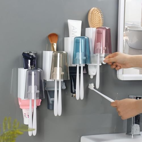 Generic - منظم فرش الأسنان ومعجون الأسنان بتصميم حديث يثبت على الحائط مع 4 أكواب أكريليك بلاصق قوي لا يحتاج للثقب للتخزين في حوض الحمام وموفر للمساحة وسهل التركيب للاستخدام المنزلي والمطبخ