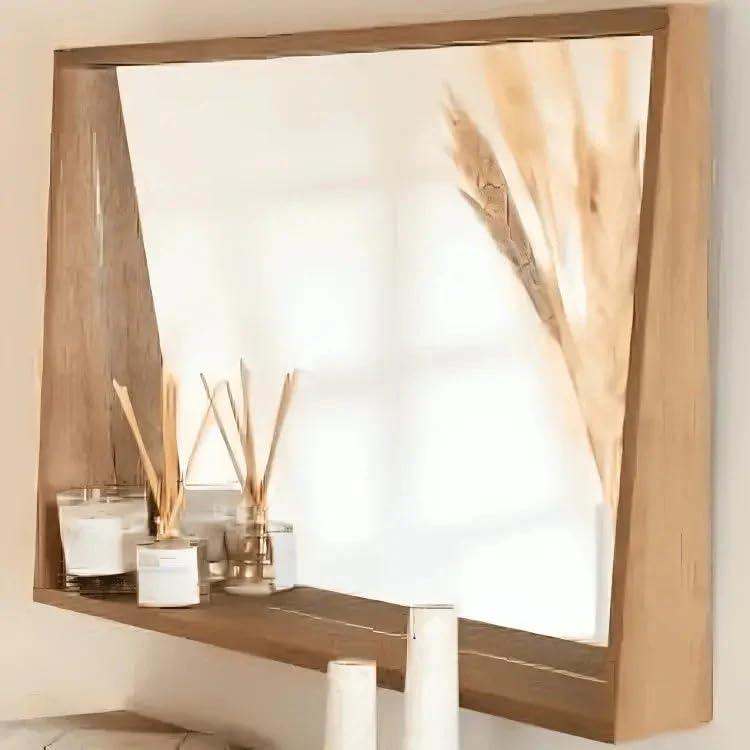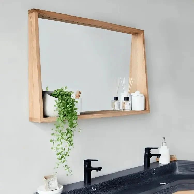 Generic - مرآة حائط خشبية عصرية مع رف بإطار طبيعي، مرآة زينة عصرية للحمام بحافة عرض للتخزين