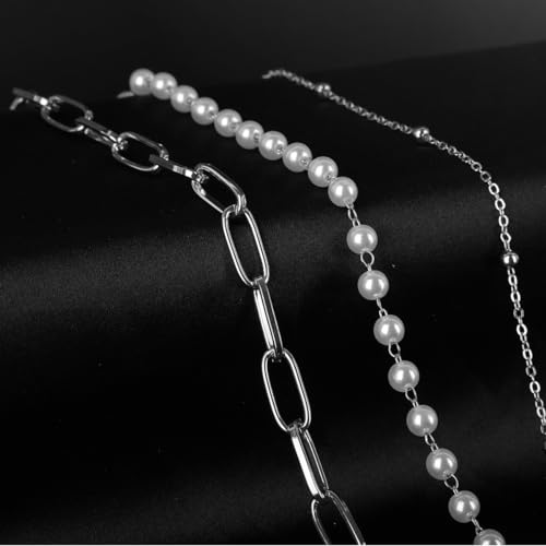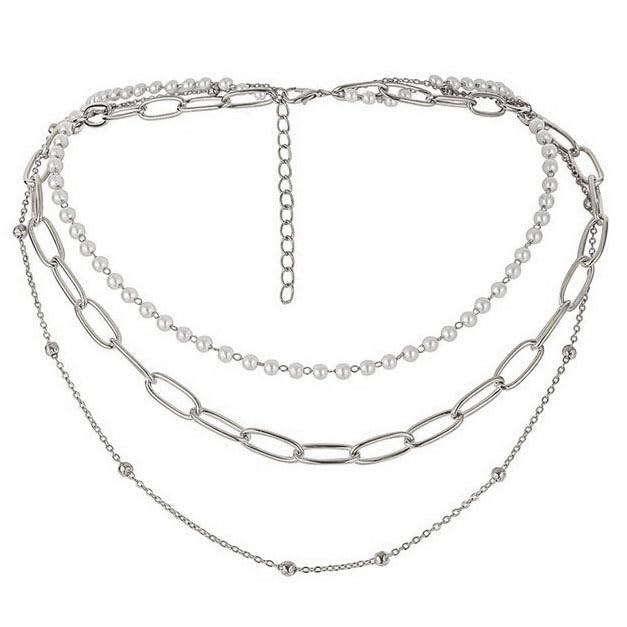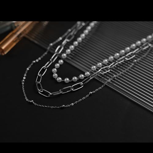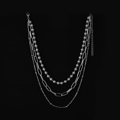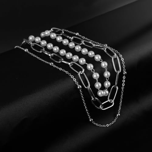 Modernplus - عقد بطبقات مكتنزة من اللؤلؤ الفضي انيق للنساء سلسلة عصرية بمشبك ورق قلادة