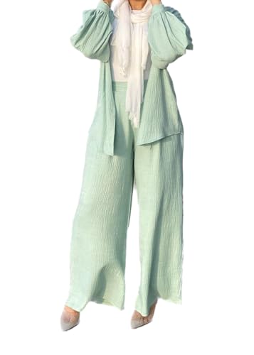 Generic - طقم بالازو بارجل واسعة محتشم، قماش بينك مجعد، قطعتين مع كارديجان وبنطلون