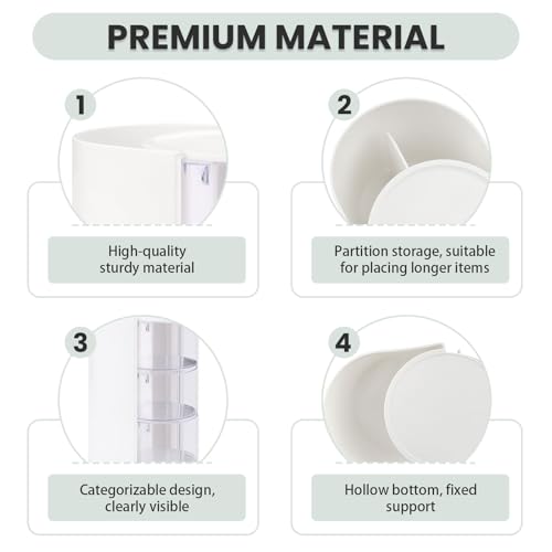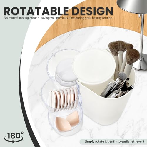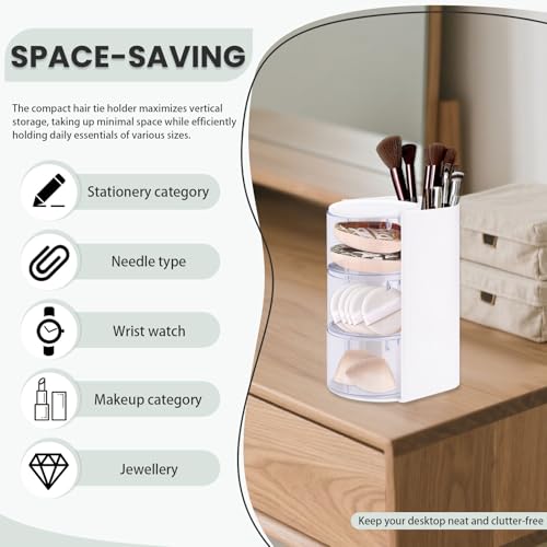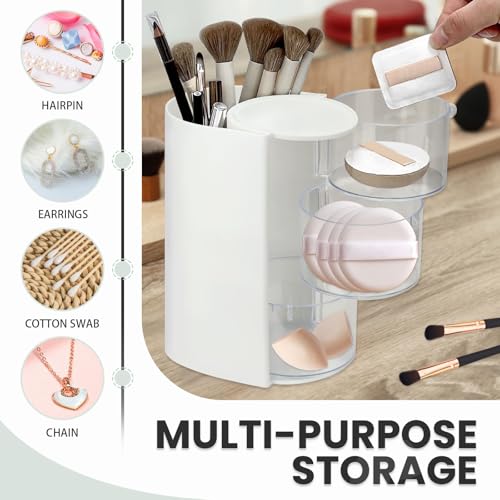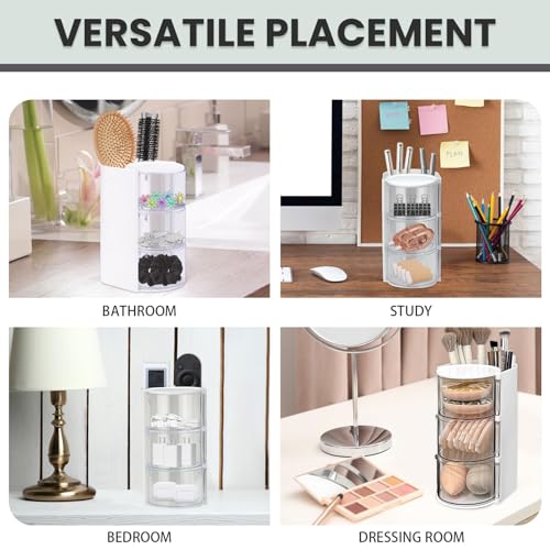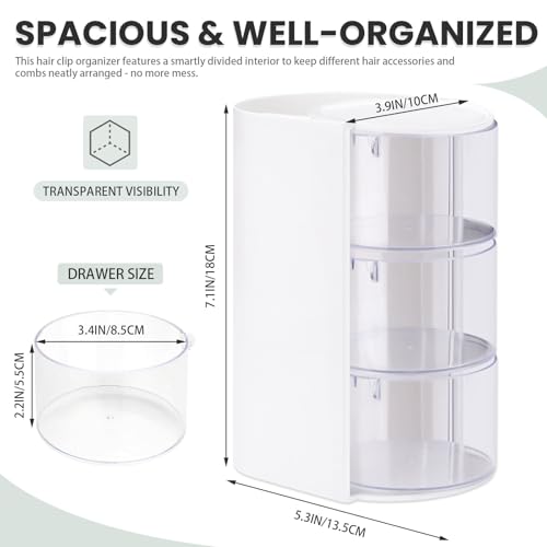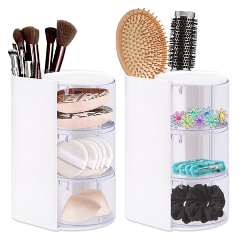 Modixun - عبوة من قطعتين من منظم اكسسوارات الشعر مع حامل فرشاة شعر، درج شفاف قابل للدوران من 3 طبقات، حامل اسفنجي للمكياج ومسحات قطنية للحمام، صندوق مجوهرات وموزع كرات (ابيض)