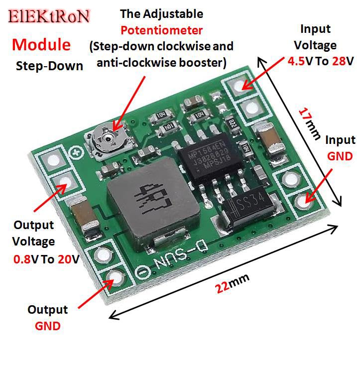- وحدة تخفيض الجهد الكهربائي 3 امبير تيار مستمر محول باك منظم الجهد قابل للتعديل امدادات الطاقة MP1584EN 24 فولت إلى 12 فولت 9 فولت 5 فولت 3 امبير وحدة لوحة لبطارية السيارة والدراجات النارية MP1584EN وحدة قابلة للتعديل 3 امبير الإدخال: تيار مستمر 4.5 فولت -- 28 فولت -- جهد خرج قابل للتعديل تيار مستمر 0.8 فولت -- يجب ألا يتجاوز تيار الحمل 20 فولت 3 امبير