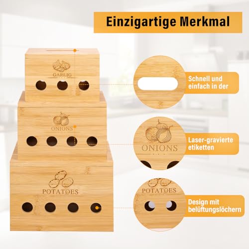 - تخزين متين للبصل والبطاطس: صندوق الثوم الخاص بنا مصنوع من خشب الخيزران عالي الجودة مع حواف ناعمة ونقش ليزر فريد، صندوق البطاطس هذا قوي ومقاوم للرطوبة، بحيث تكون خضرواتك محمية بشكل جيد.