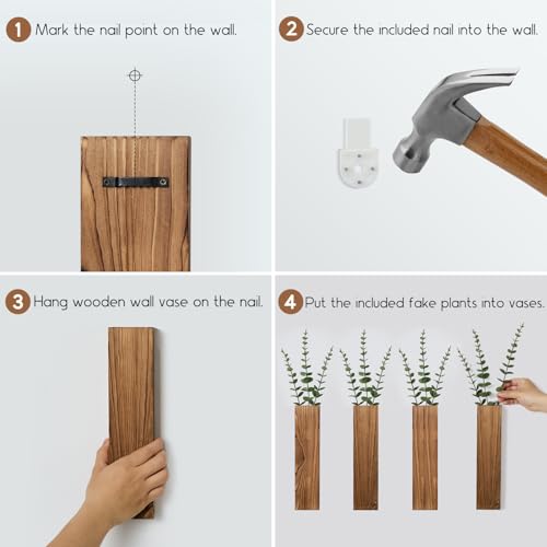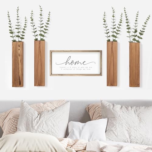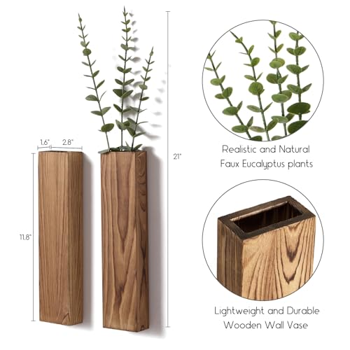 Mokof - 4 قطع من اوعية نباتات الحائط الخشبية مع سيقان الاوكالبتوس المزيفة، مزهريات خشبية عصرية لديكور الحائط لغرفة المعيشة وغرفة النوم والحمام (بني داكن)