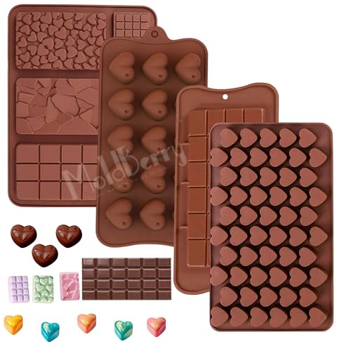 MoldBerry - مجموعة قوالب شوكولاتة سيليكون من مولدبيري مكونة من 4 قطع | لوح شوكولاتة بـ 9 تجاويف و15 قالب قلب و55 قالب صغير على شكل قلب وقالب شوكولاتة كنافة | قوالب خبز غير لاصقة قابلة لاعادة الاستخدام لصنع الحلوى