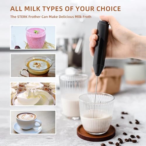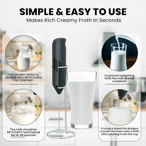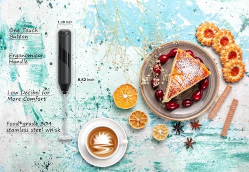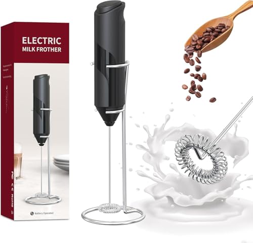 MOMENT - مومنت صانع رغوة حليب محمول باليد مع حامل، صانع رغوة قهوة قوي يعمل بالبطارية، خلاط مشروبات كهربائي صغير لخفق القهوة واللاتيه والكابتشينو والماتشا والشوكولاتة الساخنة (اسود)