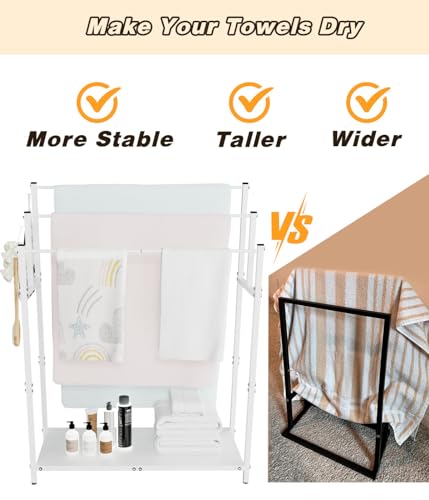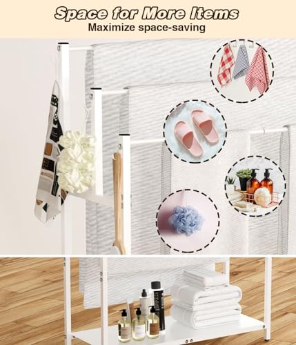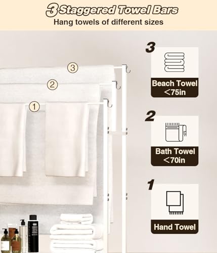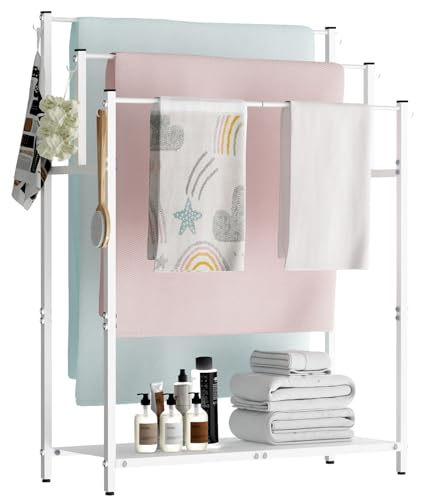 Mondazie - رفوف فوط طويلة قائمة بذاتها من موندازي بطول 1.12 متر مع 6 خطافات للحمام، 3 طبقات كبيرة الحجم، حامل تجفيف فوط حمام السباحة، حامل معدني مع رف تخزين لغرفة النوم وغرفة المعيشة، أبيض