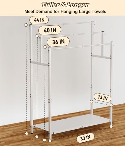 - 【أطول وأطول】بالمقارنة مع رفوف المناشف الأخرى القائمة على الأرض، فإن حامل مناشف الحمام الخارجي الخاص بنا أطول وأطول وأعرض. توفر ارتفاعًا وطولًا واسعين لاستيعاب المناشف والبطانيات كبيرة الحجم. يبلغ الارتفاع الكلي لرف المناشف 44 انش، مما يضمن عدم لمس الأرض حتى أطول المناشف المعلقة عليه، مما يحافظ على نظافة المناشف. يبلغ طول رف المناشف 33 انش، مما يسمح بتوزيع المناشف للتجفيف دون الحاجة إلى الطي، مما يتيح التجفيف السريع.