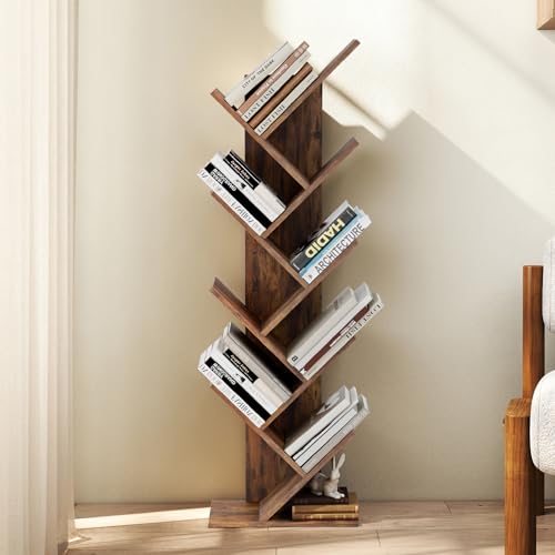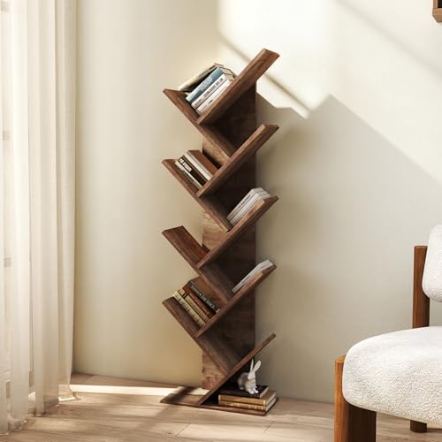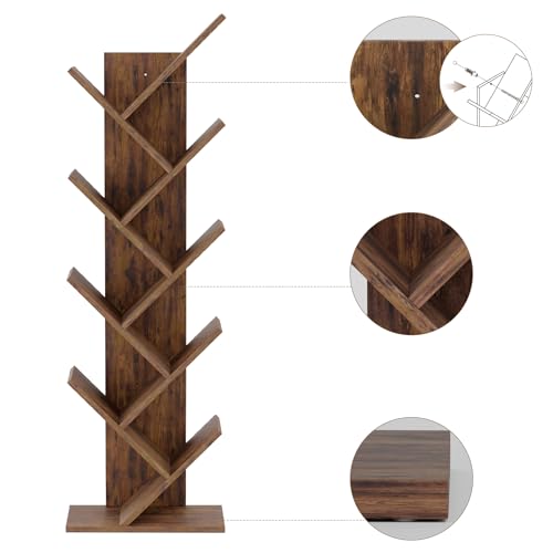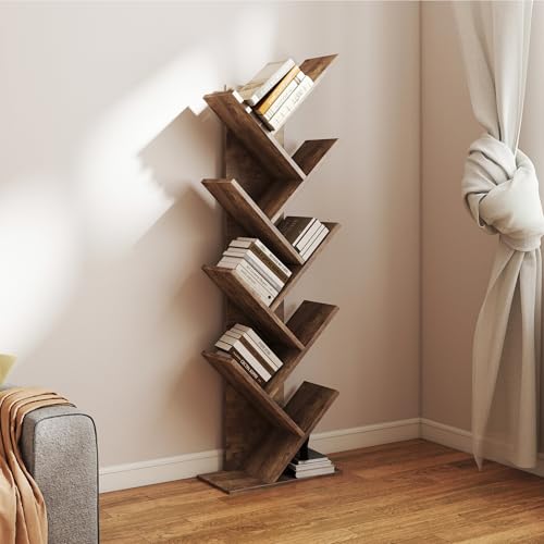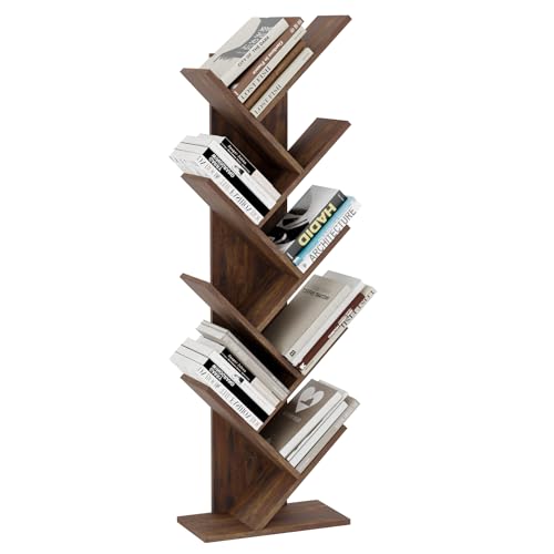 Mondeer - خزانة كتب من موندير، رف كتب على شكل شجرة من 8 طبقات، ارفف خشبية قائمة على الارض للاقراص المضغوطة والمجلات في غرفة المعيشة والمكتب المنزلي، 40 × 20 × 127 سم، بني ريفي