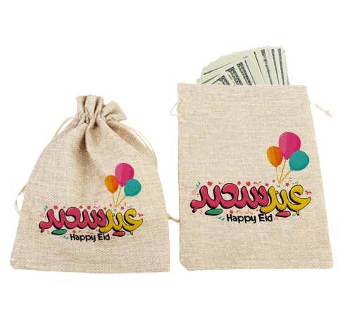 - تصميم احتفالي: حقيبة برباط من الكتان باللون البيج تتميز بتصميم "Happy Eid" نابض بالحياة وملون مع بالونات مزخرفة، مثالية للاحتفال بالمناسبات الخاصة