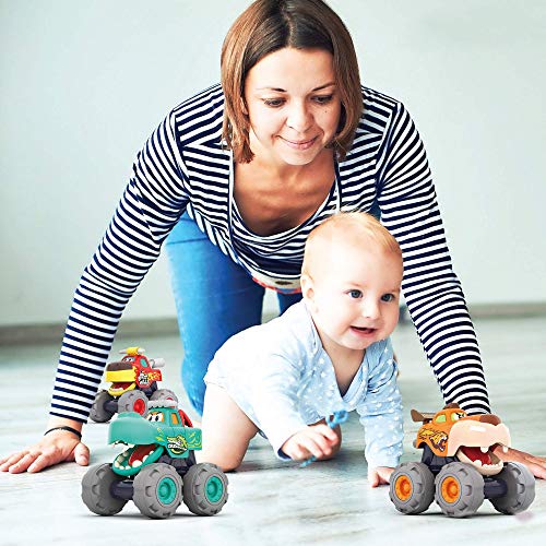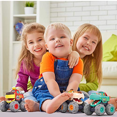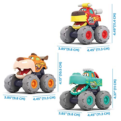 Stone and Clark - لعبة أطفال من 3 شاحنات تعمل بالسحب للخلف بتصميم مونستر تراكس بقوة احتكاك ووظيفة عجلة حرة، سيارات لعبة كهدايا للأطفال والرضع بنمط حيوانات مرحة للأطفال من عمر 12 شهر فأكثر / 1 سنة