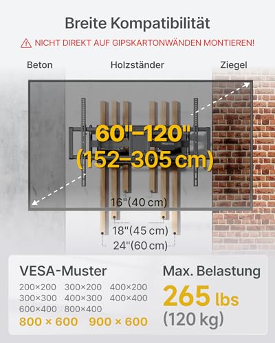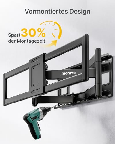 monTEK - حامل حائط للتلفزيون مونتيك XXL متين وكامل الحركة للتلفزيونات الكبيرة جدًا مقاس 60-120 بوصة - سعة حمولة تصل إلى 120 كجم، بحد أقصى فيسا 900 × 600، قابل لدوران وإمالة، حامل حائط للتلفزيون مجمع مسبقًا