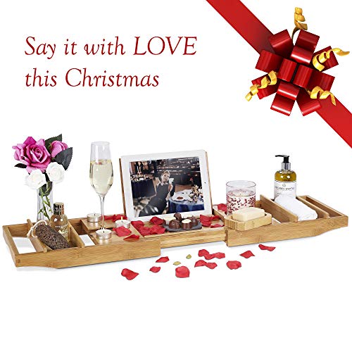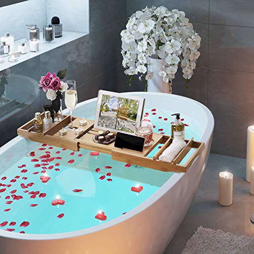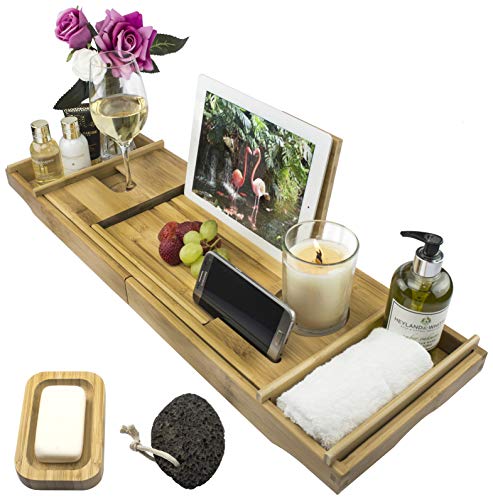 - حوّل وقت الاستحمام إلى تجربة سبا منزلية مفعمة بالاسترخاء والرفاهية. صينية استحمام من الخشبي مزودة بحامل لجهاز اي باد وأشرطة لتثبيت صفحات الكتب ومكان مانع للانزلاق لكؤوس المشروبات، بالإضافة إلى فتحات للموبايل والشمعة أيضًا.